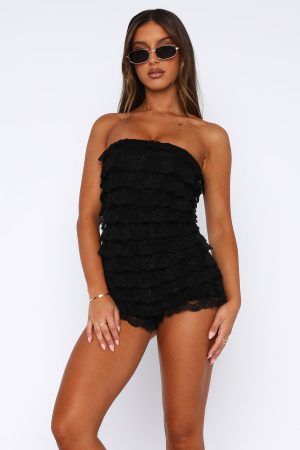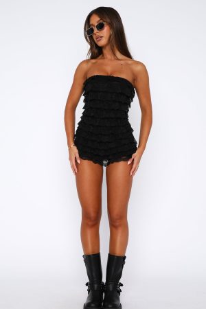 Make a statement in the Red Flags Playsuit Black! Features an off the shoulder design. grip tape. hidden centre back zipper with hook & eye. grip tape. layered frill design. lace fabric. lined and soft. stretch design. Pair with a knee high boot. gold accessories and bold sunglasses for a stand-out festival fit’!