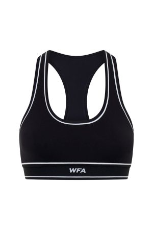Glow‑up mode activated in the Regimen Sports Bra in Black/White. Designed with thick shoulder straps. a flattering scoop neckline with subtle piping. supportive elastic under‑bust with printed WFA initials at the centre front. removable padding. and a sleek racerback. Style it with the matching Precision Leggings for a coordinated studio look that feels fresh.