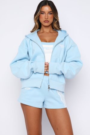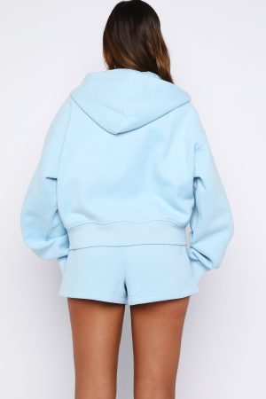 Hot chocolate weather calls for the Release 15 Asalia Boxy Zip Front Hoodie in Blue. Designed with a double lined hood. ribbed cuffs. and ribbed hem band. This boxy fit hoodie features long sleeves. front pocket. double ended front zipper closure. and an unlined fleece interior. this hoodie delivers a cozy feel. Finished with puff print White Fox text side front. Style with the matching Release 15 Asalia Wide Leg Sweatpants for a cosy look.