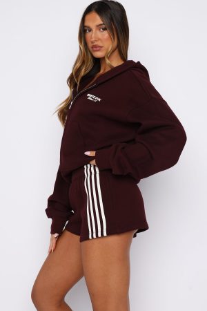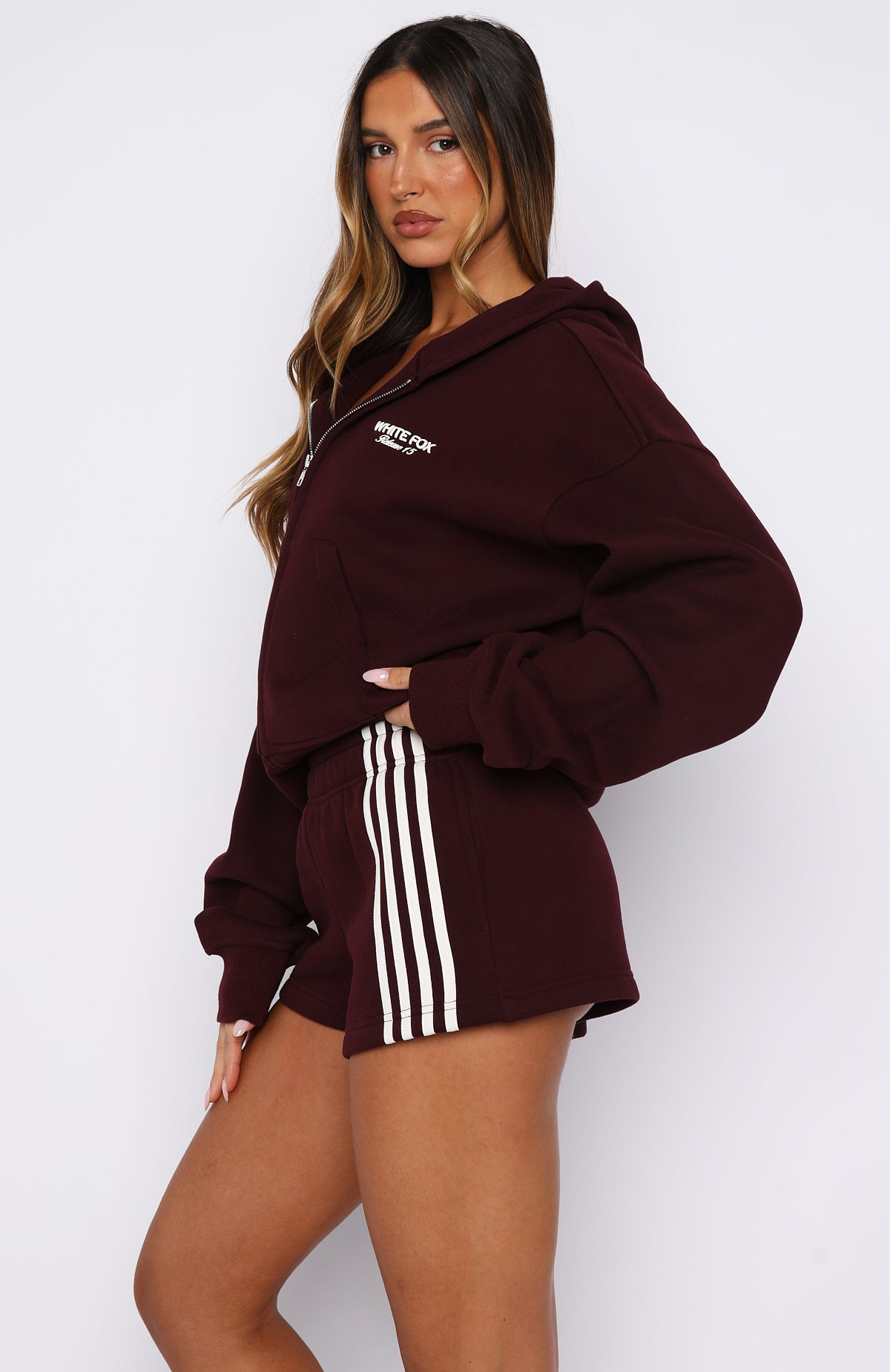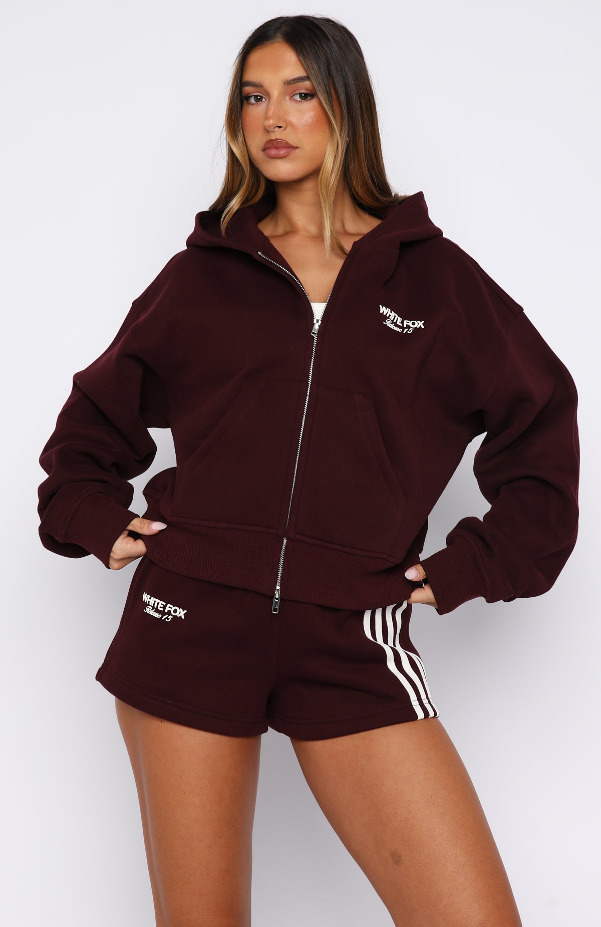 Let’s get cozy in the Release 15 Asalia Lounge Shorts in Plum. Features a thick elastic waistband with internal drawstring. convenient side pockets. unlined fleece interior. contrast stripe detailing down one side front. printed White Fox text on the other side front. and a loose relaxed fit. Style with the matching Release 15 Asalia Boxy Zip Front Hoodie for an easy-going. coordinated outfit that’s perfect for laid-back days and comfy vibes.