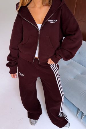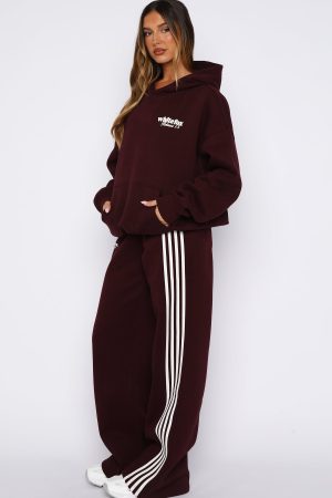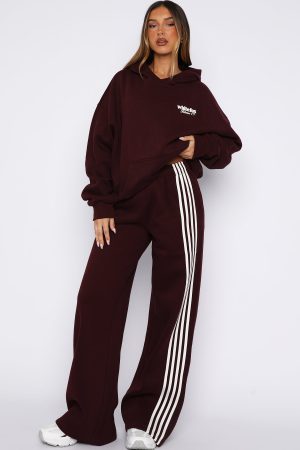 All kinds of happy in the Release 15 Asalia Wide Leg Sweatpants in Plum. Features a thick elastic waistband with internal drawstring. relaxed wide-leg silhouette. side pockets. contrast stripe detailing down one leg. and White Fox puff-print text on the other side front. Finished with a cosy unlined fleece interior. Pair with the matching Release 15 Asalia Boxy Zip Front Hoodie for an effortlessly cool. head-to-toe lounge look that feels as good as it looks.