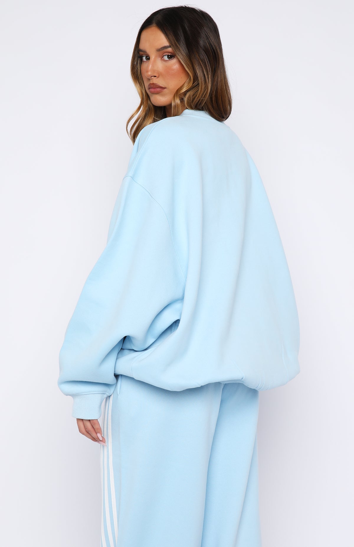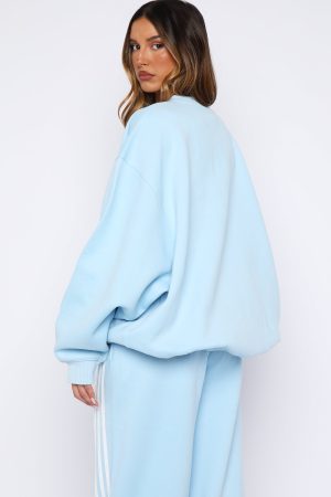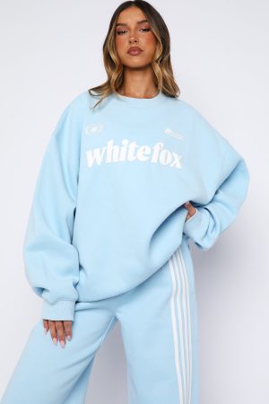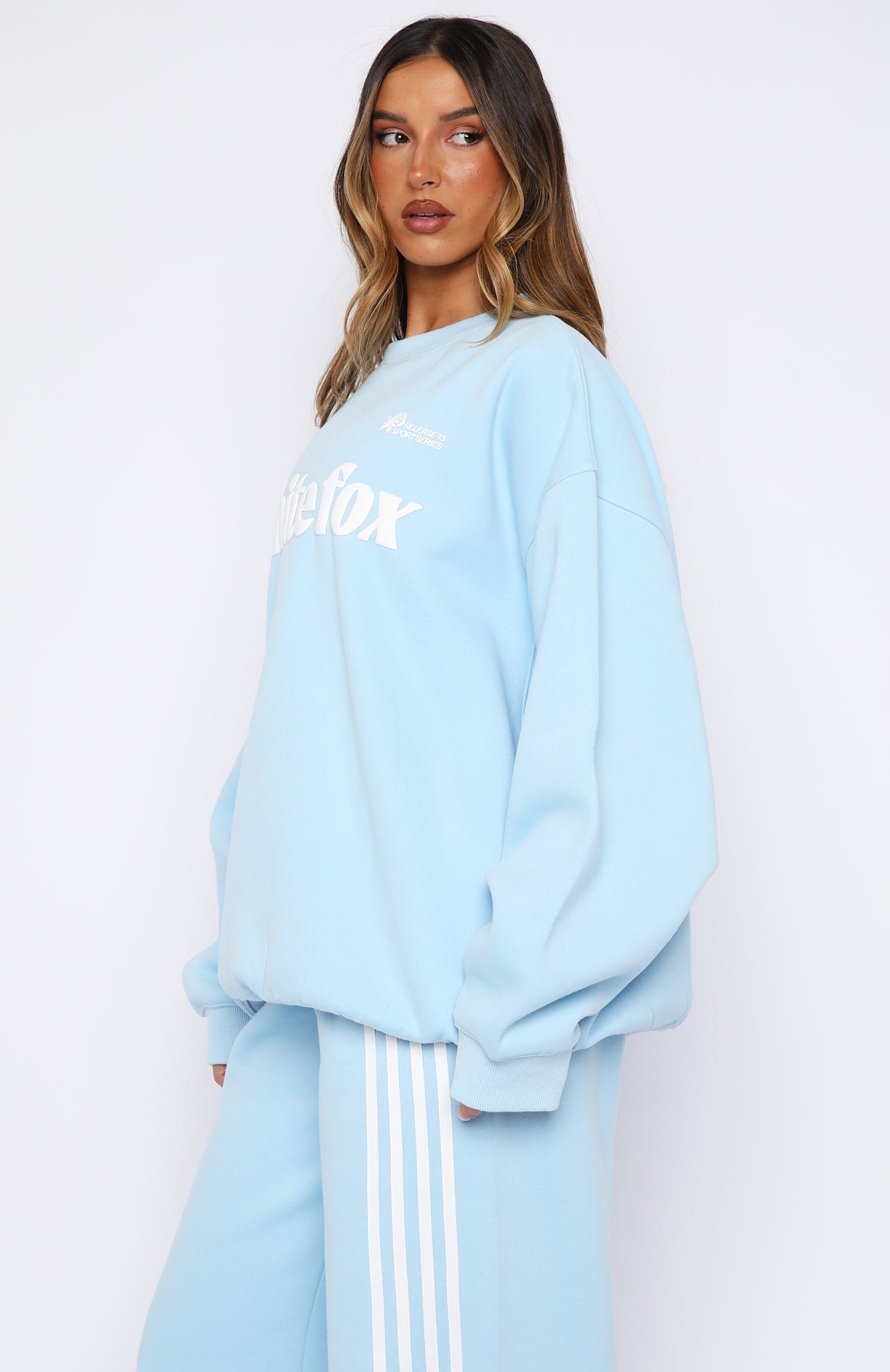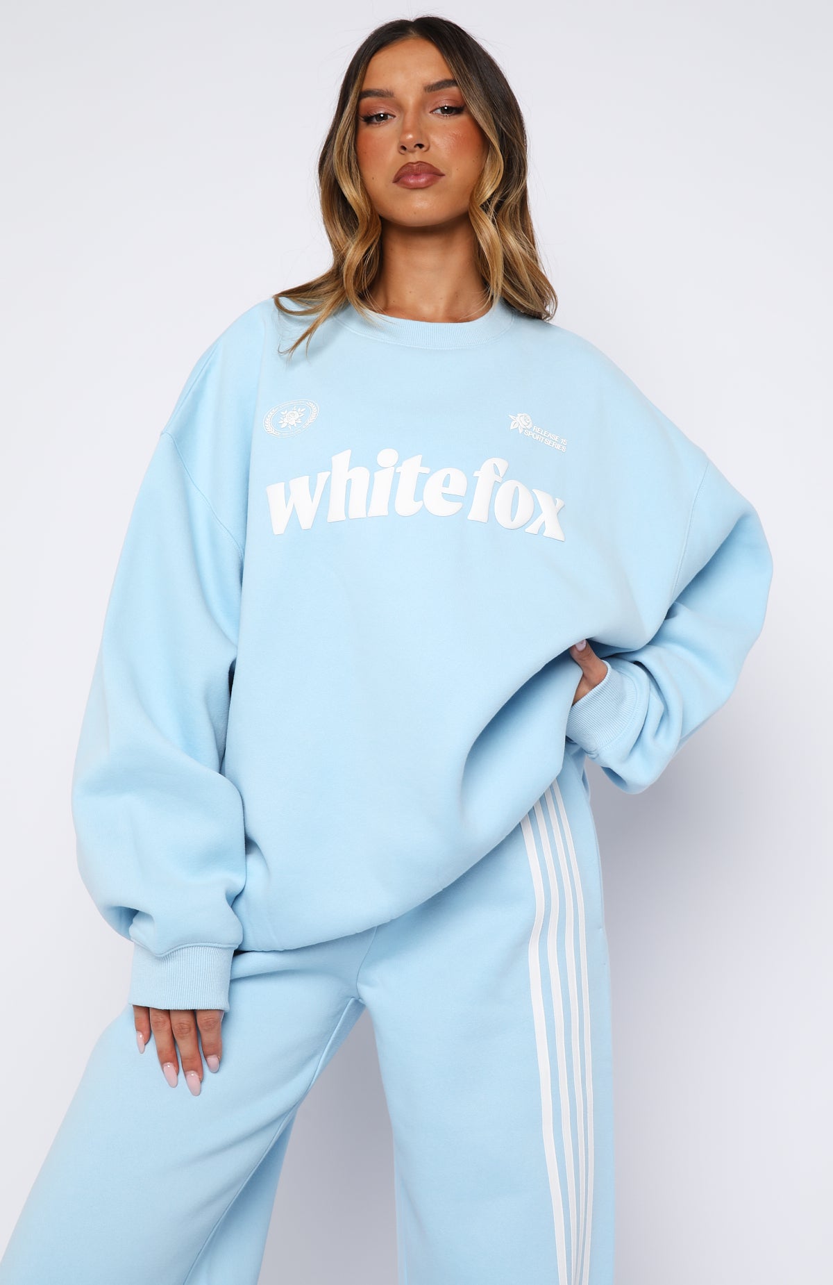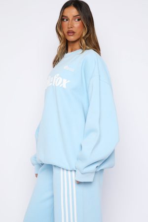 Weekending done right in the Release 15 Janie Oversized Drop Shoulder Sweater Blue. Designed with ribbed crew neckline. drop shoulders and ribbed hems which round out an oversized silhouette. Featuring long sleeves. and an unlined fleece interior. this sweater delivers a cozy feel. Finished with White Fox puff print text paired with rose graphic centre front. Style with the matching Release 15 Asalia Wide Leg Sweatpants.