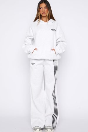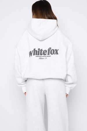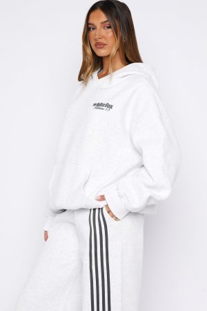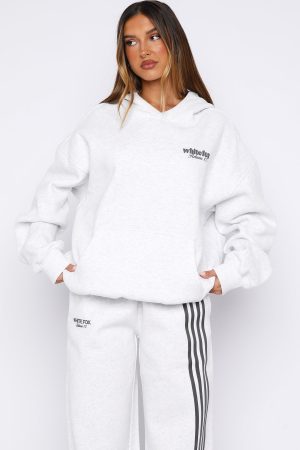 Cozy nights. crisp days in the Release 15 Kiana Oversized Hoodie Grey Marle. Designed with a double lined hood. slouched shoulders and firm ribbed hems which round out an oversized silhouette. Featuring long sleeves. a roomy front pocket. and an unlined fleece interior. this hoodie delivers a cozy feel. Finished with White Fox puff print text side front. Style with the matching Release 15 Asalia Wide Leg Sweatpants.