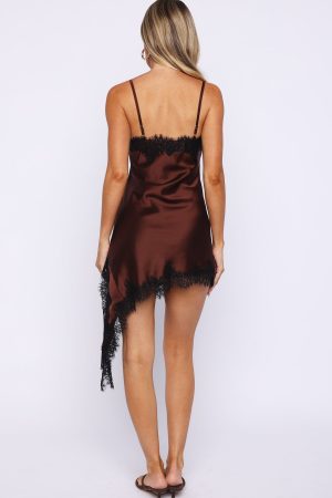 Perfect combo… silky and lace! The Reminders Of Me Lace Trim Mini Dress in Chocolate/Black features thin shoulder straps. an asymmetrical neckline trimmed with lace. and a matching asymmetrical hem with lace accents that moves beautifully with you. The relaxed silhouette keeps it comfortable yet stylish. Pair it with kitten heels for a polished. date-night finish.