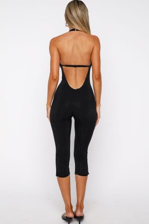 One for the outfit diary! The Retrograde Romance Embellished Jumpsuit in Black features a halter strap with a button closure at the nape. a soft scoop neckline. and a figure‑hugging silhouette. Capri‑length trousers meet a bold backless cut with an adjustable strap. while full lining. sparkling diamante embellishments. and stretchy fabric complete this standout look. Slide into clear heels and stack delicate gold necklaces and rings for a Paris night that glows just as bright as the city lights.