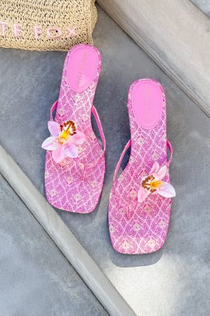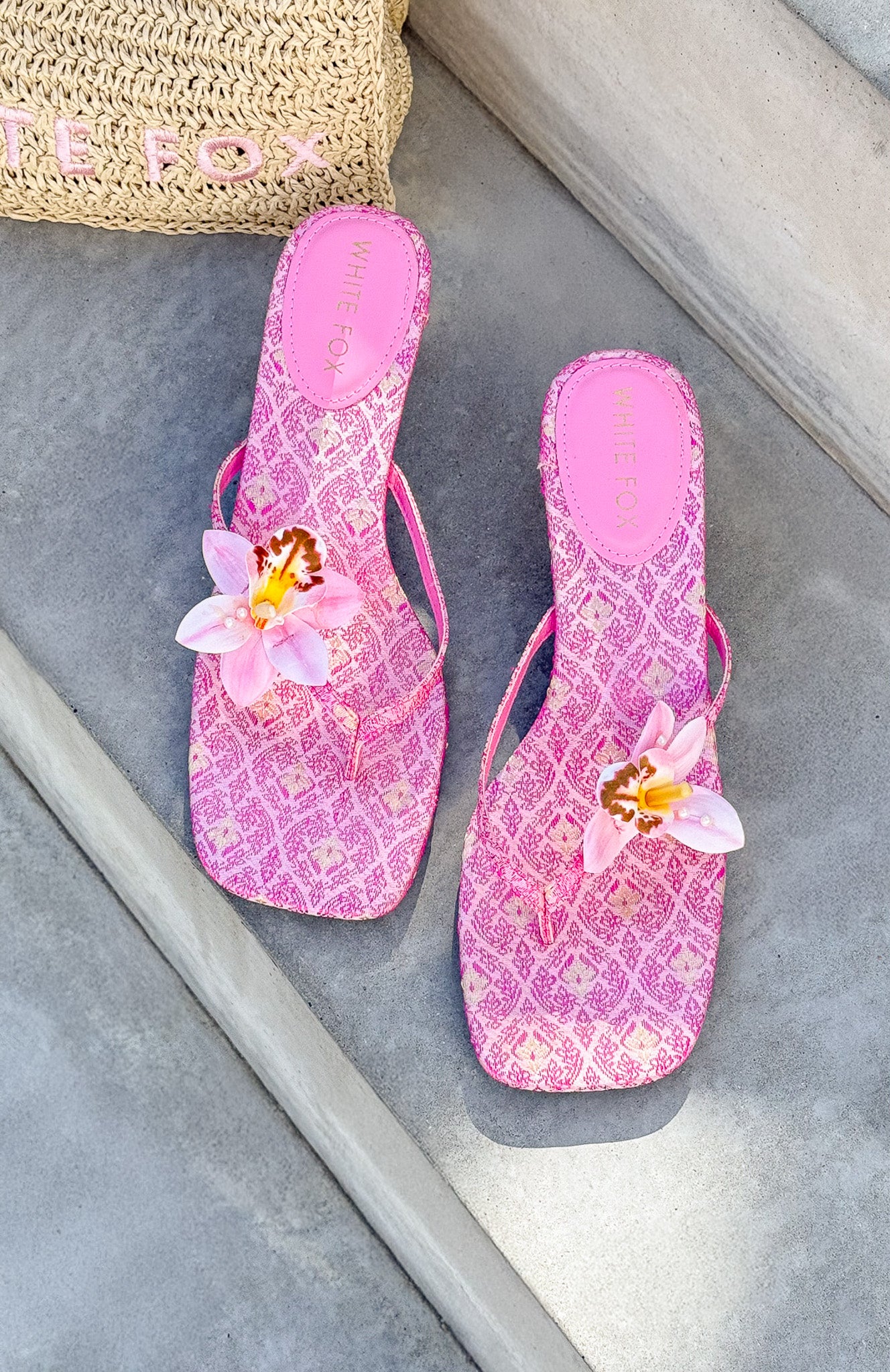 A summer must-have! The Rhea Orchid Thong Mules in Pink bring instant sunshine to your warm-weather wardrobe. Featuring a delicate thong strap with a floral accent. a chic mini-heel and a fun. summery pattern on the sole. Pair them with a matching bikini and breezy cover-up for an effortless beach-to-brunch look.