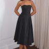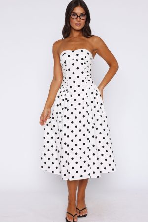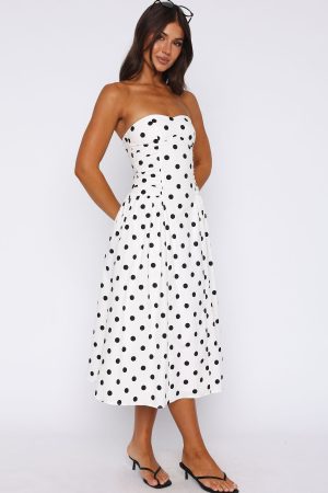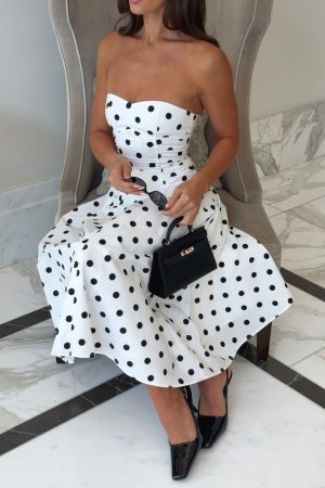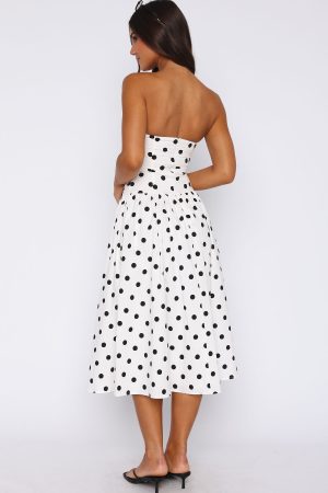 We have fallen in love! The Rich In Love Strapless Maxi Dress in White/Black Polka Dot features a strapless neckline. bust cups. ruched panelling to define the waist. pleated skirt for volume. invisible zipper with hook and eye closure centre back and lined. Team with a simple heel and paired back gold jewellery for a timeless look!