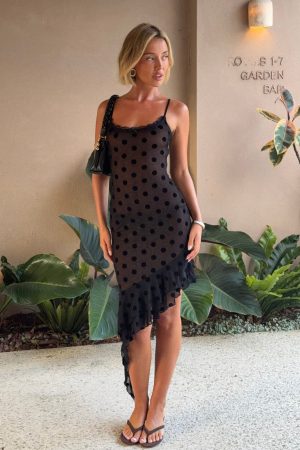 When in doubt. overdress! The Ritz And Romance Midi Dress Black Polka Dot features delicate adjustable straps. scoop neckline trimmed in lace with an elegant bow. velvet polka-dot fabric and a asymmetrical frilled hem. Mesh-lined and shaped with a side zipper and secure hook-and-eye closure. Style with your tallest heels and layered gold jewellery for a bold. confident look.