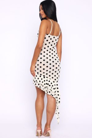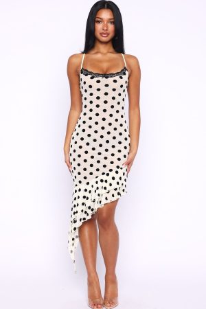 When in doubt. overdress! The Ritz And Romance Midi Dress Cream Polka Dot features delicate adjustable straps. scoop neckline trimmed in lace with an elegant bow. velvet polka-dot fabric and a asymmetrical frilled hem. Mesh-lined and shaped with a side zipper and secure hook-and-eye closure. Style with your tallest heels and layered gold jewellery for a bold. confident look.