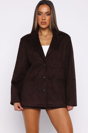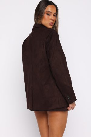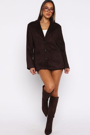 NEWEST OBSESSION: Suede! Our Rival Faux Suede Blazer in Chocolate features a collared neckline and a tailored. structured silhouette accentuated by padded shoulders. Designed with long sleeves. a sleek front button closure. practical side pockets. and a fully lined interior. Style with a white tank and low rise jeans for the cutest fit!