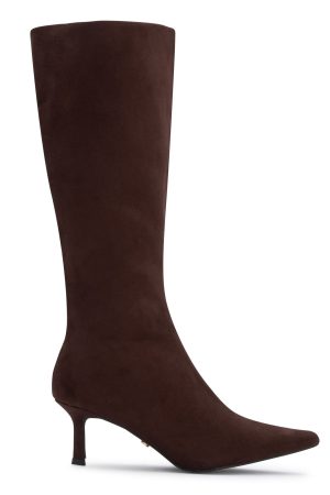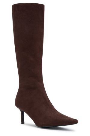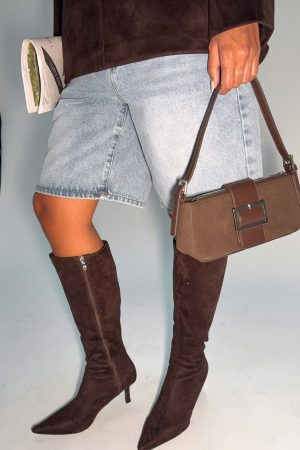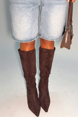 Our Rosalina Knee High Boots in Chocolate Faux Suede meets the classic and timeless brief! Features a inclosed pointed toe. round heel. internal side zipper closure and the perfect knee high length. We are obsessed!