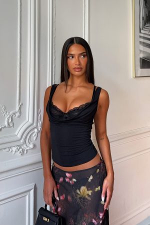 The Rose Days Top in Black is the ultimate after-dark statement. This ensemble features a built-in lace bra with sheer lining and hook-and-eye closure. worn beneath a thick-strap top with a sultry cowl neckline. Style with the Sunday Strolls Maxi Skirt Lace And Bloom. simple flats and a statement bag for a chic shopping day fit.