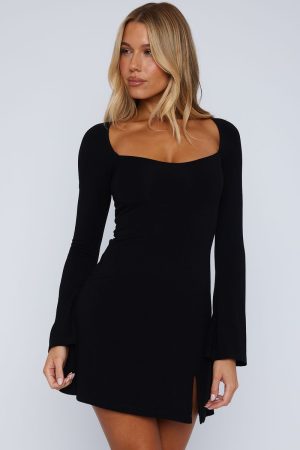 Introducing your newest LBD the Round My Head Long Sleeve Mini Dress in Black! Features square neckline. long sleeve. split on leg and stretch fabrication for an easy slip on and off. Complete the look with kitten heels. colourful shoulder bag and gold jewellery for a fit we love.