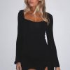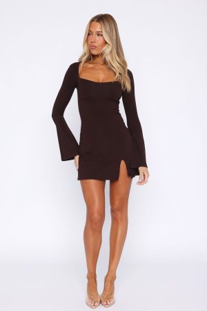 Effortlessly chic! The Round My Head Long Sleeve Mini Dress in Dark Chocolate features square neckline. long sleeve. split on leg and stretch fabrication for an easy slip on and off. Complete the look with kitten heels. colourful shoulder bag and gold jewellery for a fit we love.