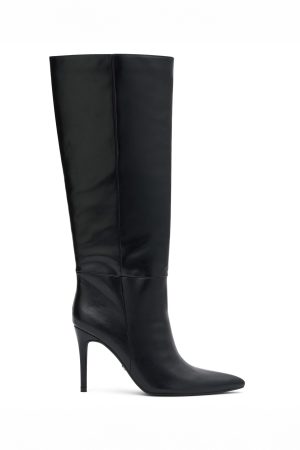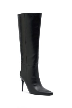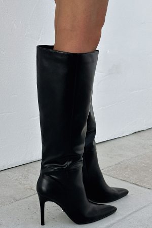 Elevate your look from the ground up with the Run Away With Me Knee High Boots Black. Features a pointed toe. stiletto heel. slip on design and textured fabric design.