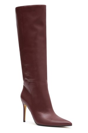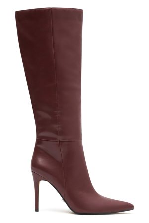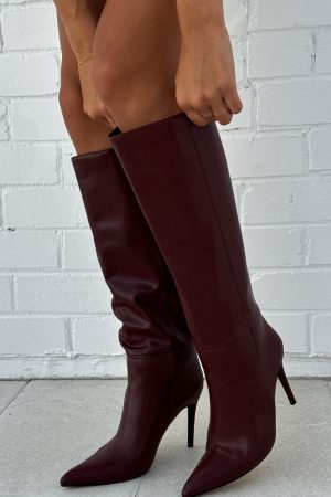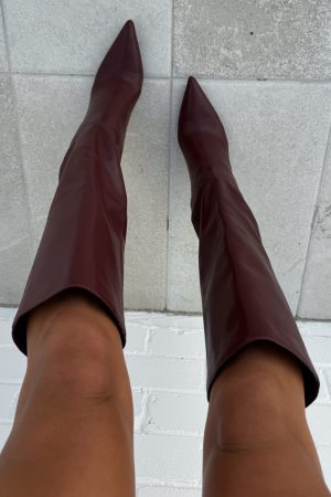 Elevate your look from the ground up with the Run Away With Me Knee High Boots Burgundy! Features a pointed toe. stiletto heel. slip on design. textured fabric design and black sole.