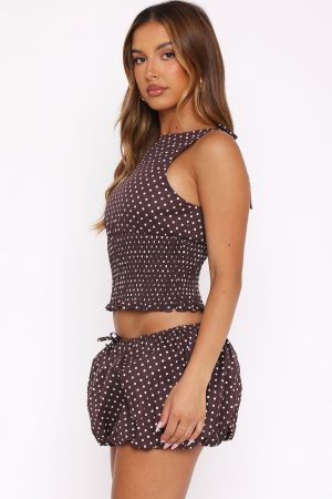 It’s a love story. baby just say yes… to the Runaway Heart Mini Skirt Chocolate Polka Dot! Featuring a thin. elasticated waistband with drawstring tie. bubble skirt design. mesh lined and built in booty shorts. Style with the matching Runaway Heart Top Chocolate Polka Dot for a look worthy of stares!