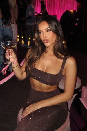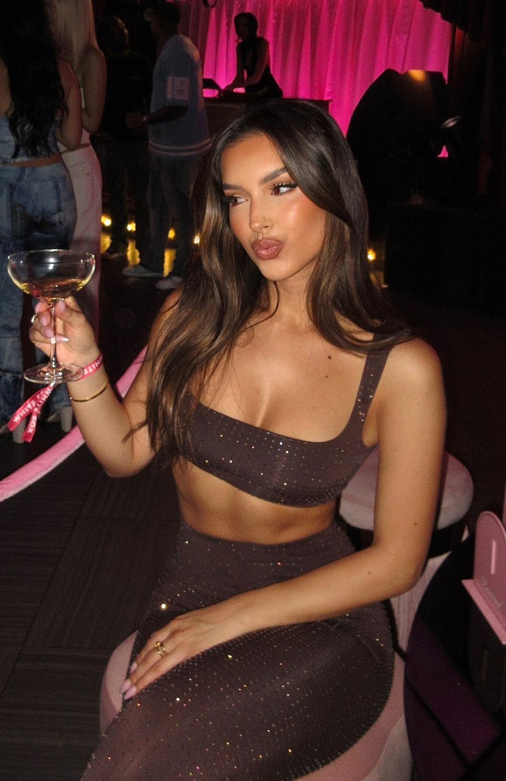 Make an entrance in the Running Late Embellished Crop Chocolate. Features thick shoulder straps. lining. diamante embellishments and super cropped length. Pair with the matching Running Late Pants for extra style points.