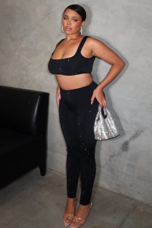 Make an entrance in the Running Late Embellished Pants Black. Features elastic waistband. lining. diamante embellishments and stretch material. Pair with the matching Running Late Crop for extra style points.