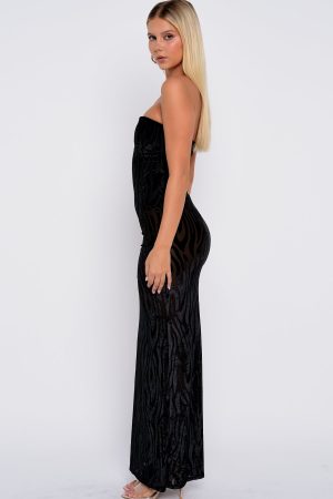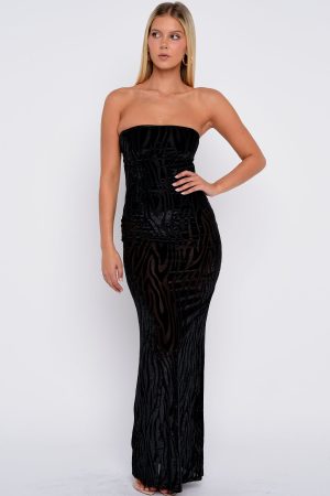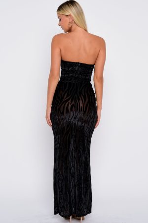 Flowy. flirty. and made for you! The Running The Show Strapless Maxi Dress in Black features a strapless neckline with discreet grip tape. a luxurious sheer velvet-print fabric. and an internal bodysuit with a secure hook-and-eye crotch closure. The underbust seam ensures sculpted support. while an invisible back zipper with hook closure maintains sleek lines. Just add kitten heels and layered gold jewellery to complete your effortlessly chic look.