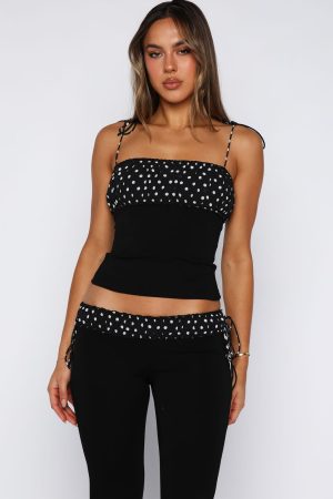 Lover girl energy! The Saving My Heart Top in Black/White Polka Dot features a square neckline. adjustable thin straps that provide bust support. high-stretch fabrication. and a loose fit at the bust and a fitted waist. For a feminine touch. the top is finished with a ruched bust detailing and elasticated bust seams. Pair with the matching Saving My Heart Pants in Black/White Polka Dot and kitten heels for a romantic vibe!