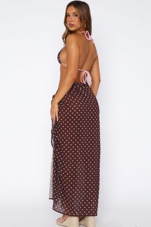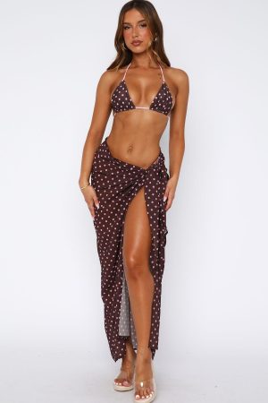 Get ready to make waves in our Seaforth Sarong Choc/Pink Polka Dot. This sarong is maxi in length with sheer light weight fabric with an adjustable fit. worn best tied to the side. Pair with one of our favourite White Fox bikini’s to complete the look.