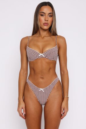 Perfect for summer frolicking and sun tanning. The Seashell Bottoms Choc Gingham feature a cheeky cut. ruched fabric. ribbon bow detail. scalloped trim. high hip design. and are lined with a gold metal plate at side back. To compliment these bikini bottoms pair with the Beachside Bikini Top Choc Gingham