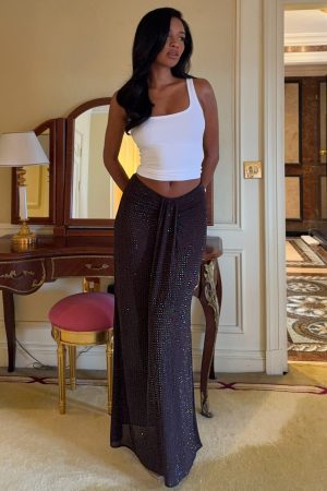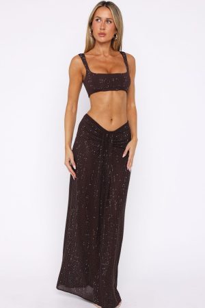 When the diamantés begin their dance. it’s time to hit the dance floor. The Secret Kisses Embellished Maxi Skirt in Chocolate features a fixed waistband. shimmering diamanté embellishments. and cinched fabric down the centre front for a subtle panel effect. Finished with a side zipper and hook-and-eye closure. the skirt is crafted from semi-sheer. unlined fabric that glides effortlessly with each step. Style with a basic tank and kitten heels to let the skirt do all the talking.