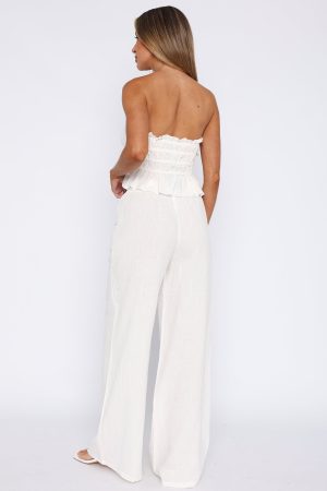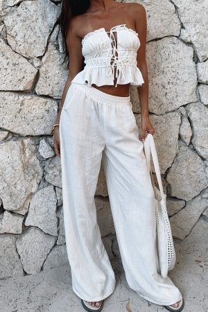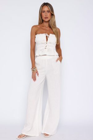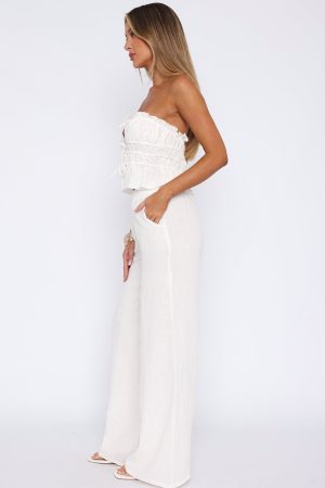 Designed to fit with ease. the Secret Society Pants White will become your favourite. Featuring a high. elasticated waistband. side pocket design and lightweight. linen fabric. We love this paired with your go-to bikini and flats for a day in the sun!