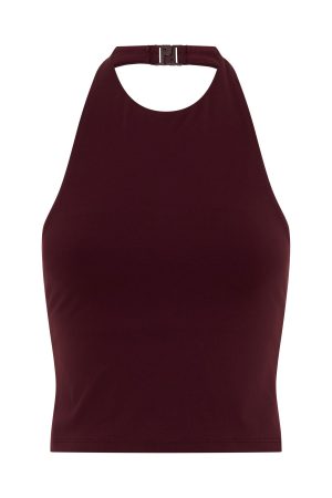 Step into your Pilates princess era with the Session Active Tank in Merlot. This backless halter-neck crop features a hook clasp closure and a fitted silhouette. Crafted from high-stretch fabric. it offers built-in bra support and removable padding. Pair it with the matching bottoms in Merlot for a coordinated look that transitions seamlessly from studio to street.