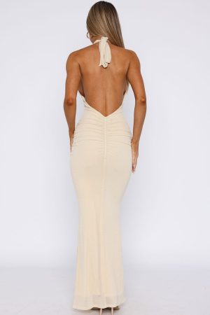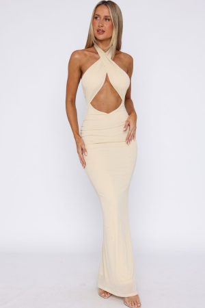 The Set For Life Halter Maxi Dress Champagne is your new glam go-to! Featuring a halter neck design with back self tie closure and cross over front. centre cut out design. backless. maxi length and lined. stretch material.