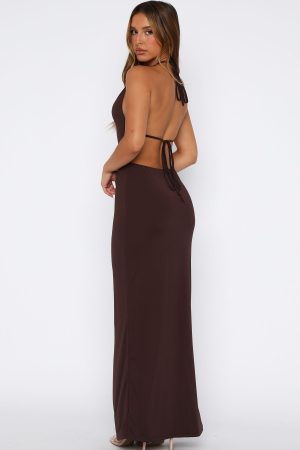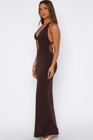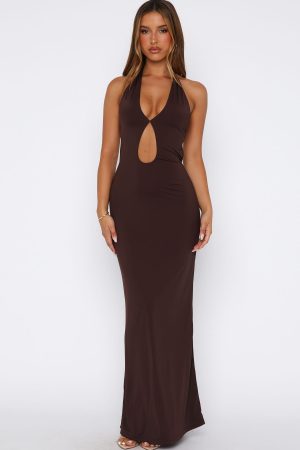 Turn heads in the Set It Straight Halter Maxi Dress Chocolate. Features low scoop neckline. halter neck strap ties. cut out design below the bust. backless and back ties for additional support. To complete the look pair with kitten heels. gold accessories and a shoulder bag for a look we love!