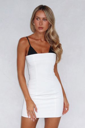 Have no regrets in the Shame For You Mini Dress in White/Black! Features adjustable thin straps. attached bra design with lace trim detailing underneath strapless dress. dress paneling for a structured fit. invisible zipper with hook and eye closure and lined.