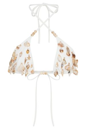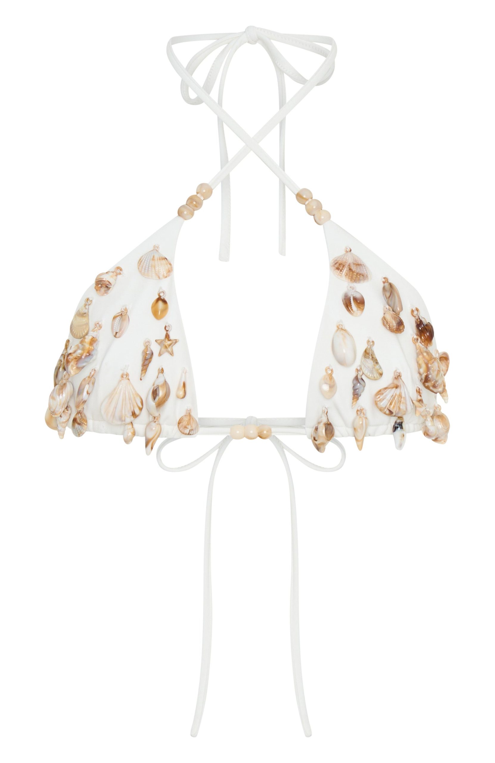 Channelling effortless beach chic. the Share It With You Top in White is your new go-to for making an entrance. Features self tie halter neck and back straps and shell detailing over fabrication.