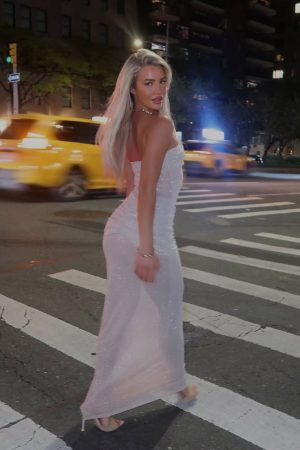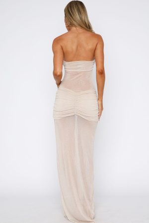 The Sheer Grace Strapless Glitter Maxi Dress Champagne was designed for unforgettable evenings in mind! Featuring a strapless design with gel grip at bust. lined at bust and skirt. sheer. glitter material. maxi length. ruched detailing and stretch material for an easy slip on design. Let the dress be the main attraction and pair with dainty gold accessories!