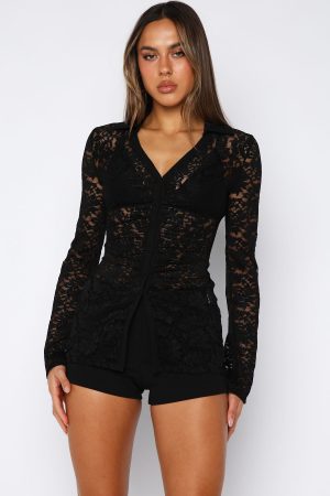 IT girl energy! The She’s A Dime Long Sleeve Lace Top in Black features a collar and v neckline. flared long sleeves and button closure down centre front. For a feminine touch this top is finished off with a sheer lace fabrication and tailored silhouette. Style with The Untold Truth Shorts and kitten heels.