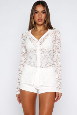 IT girl energy! The She’s A Dime Long Sleeve Lace Top in White features a collar and v neckline. flared long sleeves and button closure down centre front. For a feminine touch this top is finished off with a sheer lace fabrication and tailored silhouette. Style with Untold Truth Short in White and wedges.