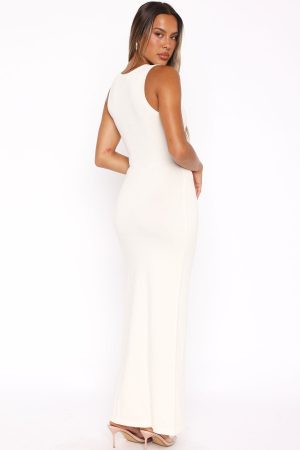 Crush update: The She’s Back Maxi Dress Off White! Featuring thick shoulder straps. front asymmetrical button up closure. maxi length. unlined. stretch. knit material for an easy slip on design. We are obsessed!