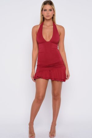 Stand out from the crowd this season in the She’s The Trend Halter Mini Dress in Soft Mulberry. Designed with confident allure. this mini dress showcases bold halter straps. a plunging neckline. and a sculpted bodice. all while offering visual texture and dimension through ruched hips and dainty frill detailing along the hem. Fully lined and crafted in a high-stretch fabric. it’s as comfortable as it is captivating. Pair with kitten heels and layered gold jewellery to let the dress speak for itself.
