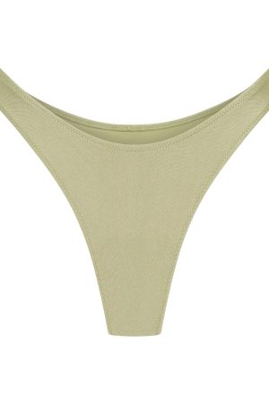 Look like a beach babe in the Shore Line Bottoms in Olive. These lined. bikini bottoms are a high hip design with cheeky cut and gold plate at back. To complete the look pair with the matching La Pelosa Bikini Top for the perfect poolside look!