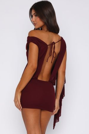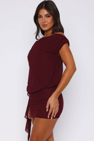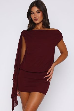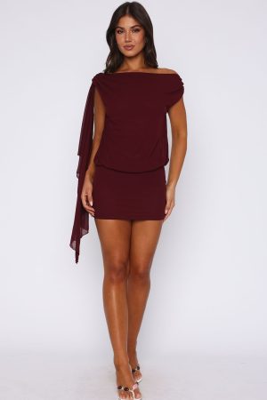 Introducing the Sicilian Dreams Mini Dress in Wine – your newest go-to mini dress for romantic date nights. Features a one shoulder neckline with feminine frill detailing. elasticated waistline. draped fabrication over bodice. fitted skirt. backless with thin self tie back straps and lined. No date night fit is complete without statement heels and junky gold jewellery!