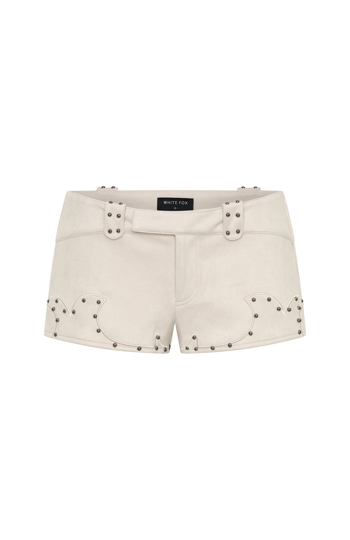 Not trying. just slayed. The Sing It Back Faux Suede Shorts in Cream features a fixed waistband and secure button-and-zip closure. while belt loops detailed with studs. Back pockets and stud accents along the hem amplify the attitude. and the faux suede fabrication delivers cool. Style with Gone Rogue Top and boots for all eyes on you.