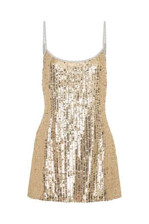 She is the moment! Introducing the Sizzling Mirage Sequin Mini Dress in Gold. Features thin adjustable straps. sequin fabrication. low back and lined. Turn heads by styling with kitten heels and statement gold earrings.