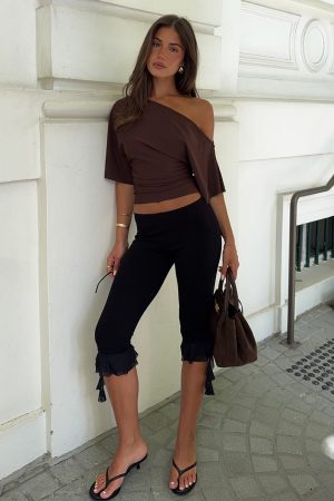 Collect memories in a statement fit! The Slay Daily Capri Pants in Black feature a thin elasticated waistband. a capri length with frill hem and sash detailing and are crafted from high-stretch fabric. Style with a tailored bustier. kitten heels and sunnies for a elevated look.