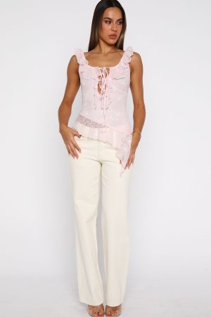 Our So Iconic Lace Top Baby Pink is designed to make an impact on summer vacation escapes. Features an elasticated off-the-shoulder neckline adorned with delicate lace trim. and keyhole cutout at the center front. complemented by a self-tie bow and lace sash. The fitted bodice is finished off with a asymmetrical hemline and lined sheer lace fabrication. Style with denim jeans. sandals and layered gold jewellery for a look we love.