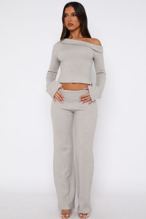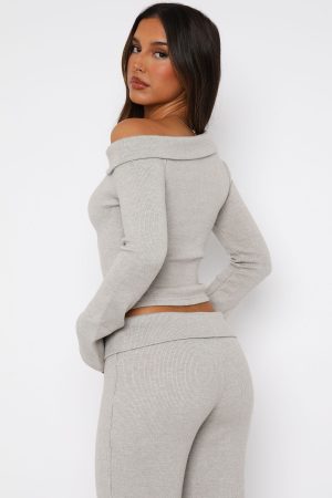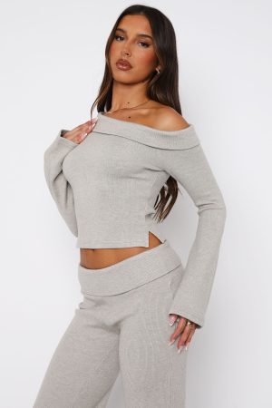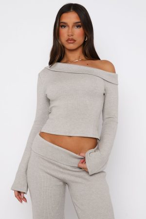 The perfect pairing! The So Little Time Long Sleeve Top Grey Marle features a one shoulder design with fold over detailing. cropped length with side split. long. flared sleeves and ribbed. stretch material for an easy slip on design. Style with the So Little Time Pants for a cozy yet chic look!