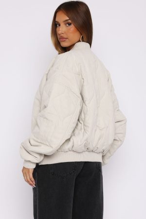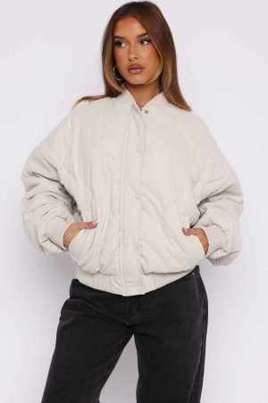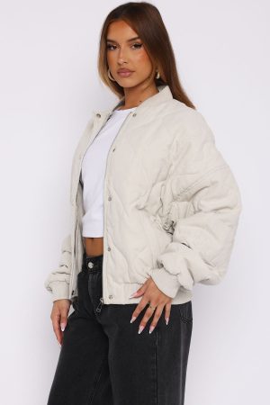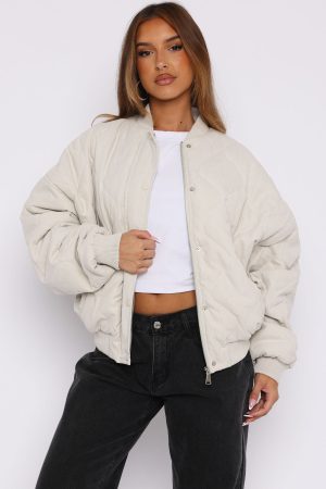 Get ready to fall in love with the Soft Love Bomber Jacket Beige this winter season. Featuring a ribbed neckline and cuffs. front snap fastener closure. slouch shoulders. oversized fit. two front pockets and lined. quilted fabric.