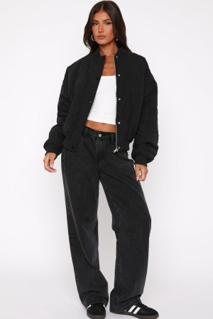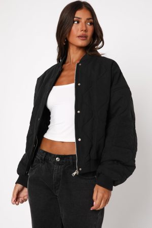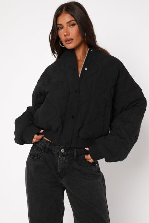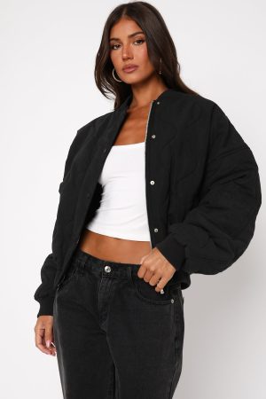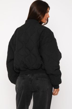 Get ready to fall in love with the Soft Love Bomber Jacket Black this winter season. Featuring a ribbed neckline and cuffs. front snap fastener closure. slouch shoulders. oversized fit. two front pockets and lined. quilted fabric.