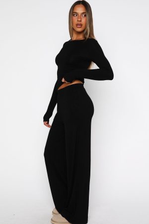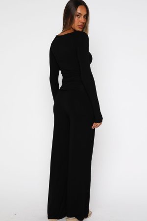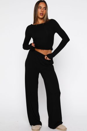 Pyjama glam is a thing … meet the Softly Slumbering Pyjama Set in Black! The long-sleeve top features a jewel neckline and gentle ruching at the sides. crafted from an unlined. high-stretch fabric. The matching pants offer a thick elastic waistband. wide-leg silhouette. convenient side pockets and also in that same high-stretch material. Slip into your go-to slippers. pop on a sheet mask. and you’ve nailed the perfect cosy night-in look.