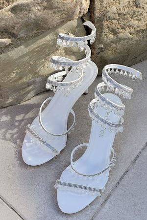 Add a touch of sparkle in the Soliel Wrap Heels White/Clear! Features an open ROUND toe. two toe straps and wrapped ankle strap with crystal detailing providing a sense of elegance. We are obsessed.